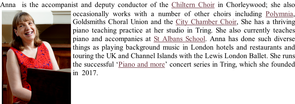 Anna was for many years a Senior House Pianist at AIMS International Summer School, where she repetiteured many opera scenes. She accompanies at Stowe School of Song, and is much in demand as an accompanist for singers and instrumentalists. She often plays orchestral piano with De Havilland Philharmonic Orchestra in Hatfield
